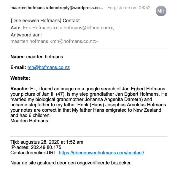 Afzender: Maarten Hofmans, kleinzoon van Henny Dame, de tweede vrouw van Jan III Hofmans.